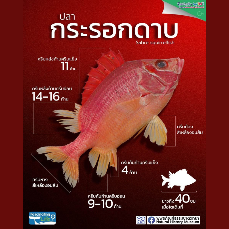 ปลากระรอกดาบคือหนึ่งในชนิดปลากระรอกวงศ์ Holocentridae ที่มีขนาดใหญ่และมีสีสวยงาม ขนาดโตเต็มที่ยาวถึง 40 เซนติเมตร โดยตัวอย่างปลาในภาพเก็บได้จากทะเลอันดามัน ประเทศไทย มีลักษณะเด่นคือ ครีบหลังมีก้านครีบแข็ง 11 ก้าน และก้านครีบอ่อน 14-16 ก้าน ครีบก้นมีก้านครีบแข็ง 4 ก้าน และก้านครีบอ่อน 9-10 ก้าน